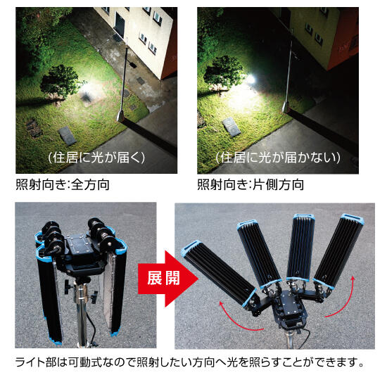 ライトの照射向きを自由に調整できるため、住宅地に迷惑をかけずに作業エリアを照らすことができます。